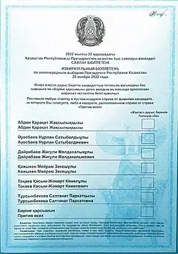 - ↑ Bulatkulova, Saniya (21 de septiembre de 2022). «Kazakhstan to Hold Presidential Elections on November 20». The Astana Times (en inglés). Consultado el 21 de septiembre de 2022.
