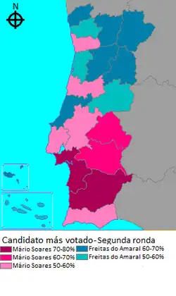 En la segunda ronda, Mario Soares logró obtener los votos de los otros candidatos de la izquierda (Zenha y Pintasilgo). Soares ganó contra Freitas do Amaral, por una pequeña diferencia de cerca de 140 000 votos, y con el apoyo fundamental del sur del país (Algarve, Alentejo y Ribatejo) y los distritos más urbanos (Coímbra, Lisboa y Oporto).[5]