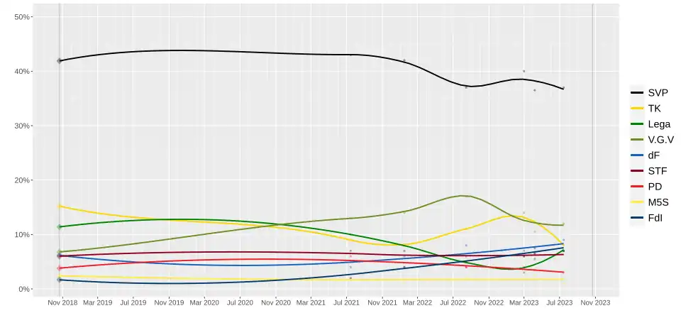 | Fecha | Encuestadora | Muestra | SVP | TK | Lega | V-G-V | dF | STF | PD | M5S | FdI | FI | Enzian | FSmW | JWA | Vita | Otros | Dif. |