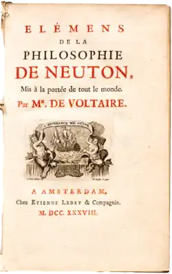 Frontispicio de Elémens de la philosophie de Newton (1738) sobre la interpretación de Voltaire de la obra de Isaac Newton, iluminado por una luz aparentemente divina que proviene del propio Newton y una musa, que representa a la amante de Voltaire, Émilie du Châtelet, quien en realidad tradujo a Newton y colaboró con Voltaire para dar sentido a la obra de Newton.