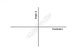 corresponde a la anchura del haz en la dirección y es la divergencia.[4] En la ausencia de aceleración y pérdidas de energía —por ejemplo, por radiación sincrotrón— la emitancia se mantiene constante, lo que permite evaluar la relación entre la anchura del haz, y su divergencia en todos los puntos de la trayectoria del haz. Esto es una consecuencia del teorema de Liouville, según el cual la densidad de partículas en el espacio de fases se mantiene constante en la presencia de fuerzas conservativas[5]. En la presencia de aceleración se usa la emitancia normalizada , que es constante en estas condiciones.[6]