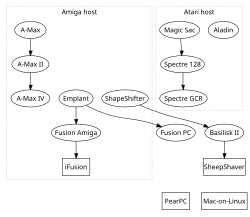 Amigas modernas como AmigaOne y Pegasos pueden emular máquinas Macintosh utilizando Basilisk II o Mac-on-Linux.