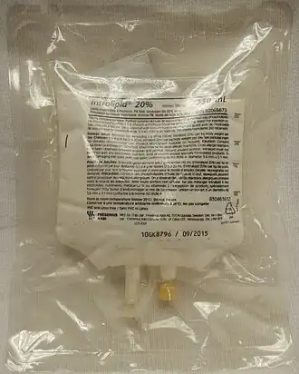 La emulsión lipídica o emulsión grasa se refiere a una emulsión de lípidos para uso intravenoso humano. A menudo se le conoce con el nombre de la marca de la versión más utilizada, Intralipid, que es una emulsión de aceite de soja, fosfolípidos de huevo y glicerina, y está disponible en concentraciones de 10%, 20% y 30%. La concentración del 30% no está aprobada para la infusión intravenosa directa, pero debe mezclarse con aminoácidos y dextrosa como parte de una mezcla total de nutrientes.