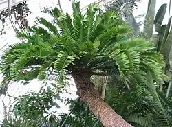 Sus rígidas frondes, como las de las palmas, miden cerca de 1,8 m, con numerosos folíolos rígidos de dientes espinosos. Un ejemplar femenino puede producir conos que parecen piñas alargadas gigantes de 45 cm de longitud.