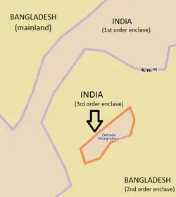 Dasiar Chhara, el cuarto enclave indio más grande por área. Está a tres kilómetros del territorio principal de la India y tiene un área de 6,65 km². Dahala Khagrabari era el único enclave de tercer de orden que haya existido hasta la fecha, un territorio indio dentro de un exclave de Bangladés qué a su vez estaba dentro de un exclave de la India en el territorio principal de Bangladés, antes de que todos los exclaves de la India mencionados anteriormente fueran cedidos a Bangladés en 2015.