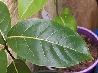 Las hojas son anchas elípticas a elípticas o ovadas, venosas y usualmente de 7–15 cm de largo, 3–6 cm de ancho, las venas con frecuencia son amarillentas. La forma horizontal de las ramas y el follaje oscuro atractivo lo convierten en un árbol particularmente hermoso.
