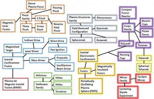 Los investigadores de la fusión han estudiado varios conceptos de confinamiento. Al principio se hizo hincapié en tres sistemas principales: z-pinch, stellarator y espejo magnético. Los principales diseños actuales son el tokamak y el confinamiento inercial por láser. Ambos diseños se están investigando a muy gran escala, sobre todo en el ITER, en Francia, donde se está construyendo un tokamak, y en el National Ignition Facility (NIF), en Estados Unidos, donde se investiga el confinamiento inercial por láser. Los investigadores también están estudiando otros diseños que pueden ofrecer enfoques más baratos. Entre estas alternativas, hay un interés creciente por la fusión de blancos magnetizados y el confinamiento electrostático inercial, así como por nuevas variaciones del stellarator.