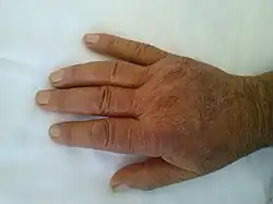 - Artritis: Los dedos hinchados y ocasionalmente el edema difuso de la mano son datos distintivos. La artritis suele ser más frecuente y severa que la observada en el LES. Aproximadamente un 60% presentan una artritis obvia, con deformidades semejantes a las observadas en la artritis reumatoide.