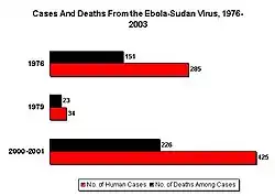 El primer brote documentado de ébola ocurrió en 1976, simultáneamente en Zaire y Sudán (zonas que hoy pertenecen a la República Democrática del Congo y a Sudán del Sur, respectivamente), donde se detectaron 3418 casos y 2830 muertes con una tasa de letalidad de 83%. Este brote fue causado por el virus ébola-Zaire, una de las cepas más epidémicas y mortales de la historia. Los brotes de fiebres hemorrágicas virales tienen una tasa de mortalidad de entre el 41 y el 89%.[10]