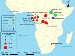 - ↑ «2014 Ebola Virus Disease (EVD) outbreak in West Africa». WHO. Apr 21 2014. Consultado el 3 de agosto de 2014.
