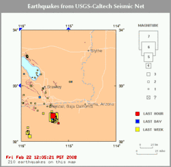 - ↑ Sandra Dibble. «Ground stays still, but reasidents in quake area rattled». The San Diego Union-Tribune. Archivado desde el original el 23 de junio de 2008. Consultado el 27 de agosto de 2008.