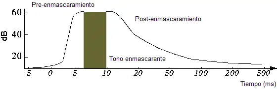 Como ejemplo gráfico tenemos la siguiente figura, donde se puede observar que la efectividad del enmascaramiento disminuye de forma exponencial para ambos casos de enmascaramiento temporal. Su duración, como ya se ha comentado, es de entre 5 y 10 ms para el caso del preenmascaramiento y de entre 30 y 60 ms para el del postenmascaramiento.