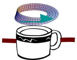 En esta situación, un espinor es una especie de vector polarizado. En el diagrama adyacente, un espinor puede representarse como un vector cuya cabeza es una bandera que se encuentra en un lado de una cinta de Möbius, apuntando hacia adentro. Inicialmente, supóngase que la bandera está en la parte superior de la tira como se muestra. A medida que se gira la taza de café, lleva el espinor y su bandera a lo largo de la tira. Si la taza se gira 360°, el espinor vuelve a la posición inicial, pero la bandera ahora está debajo de la tira, apuntando hacia afuera. Es necesaria otra rotación de 360° para devolver la bandera a su orientación original.