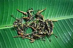 • Cigarras, chicharras, coyuyos, coyoyos, chiquilichis, tococos, cocoras, cocorrínes, cogollos, ñes, ñakyrã o totorrones, son insectos de la familia Cicadidae, que pueden vivir tanto en climas templados como tropicales. Las ninfas viven enterradas mientras que los adultos viven sobre vegetales. Se consumen en estado adulto las especies de los géneros Cicada, principalmente: (Tibicen) pruinosus (Say, 1825);[40]Odopoea, principalmente: montezuma (Distant, 1881), su sinónimo es Daza montezuma (Walker, 1850);[41]Proarna (Cacama), principalmente: maura (Distant, 1881) y Quesada (Tympanotermes), principalmente: gigas (Olivier, 1790) conocida comúnmente como cigarra común.[37]