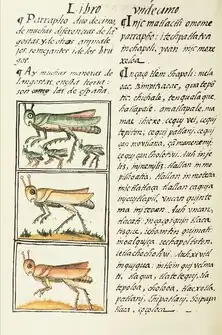 Fragmento del Códice Florentino donde se describe el uso de algunas especies de langostas, saltamontes y chapulines en la cocina local.