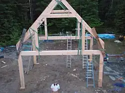 El entramado de madera tradicional es el método de crear estructuras entramadas de madera pesada unida con varias juntas, comúnmente y originalmente con juntas de traslape, y luego juntas de mortaja y espiga con clavijas. El arriostramiento diagonal se utiliza para evitar el "desplazamiento" o el movimiento de vigas o postes verticales estructurales.[14]