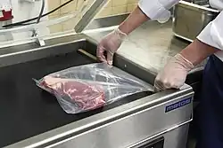 Este tipo de envasado se realiza en films de plástico poco permeables al aire. El envasado al vacío de carnes suprime la mayoría de las bacterias nocivas incluidas en los alimentos. Si bien el método de envase no supone una garantía 100%, puede mejorar su efectividad considerando otros métodos combinados: es decir envase al vacío y antioxidantes, envasado al vacío y tratamiento térmico, etc. Por regla general un envasado al vacío de una carne no tratada (ni cocida, ni curada) soporta aproximadamente diez días.[1] En el caso de carnes curadas el envase al vacío detiene el crecimiento bacteriano, prolongando su vida. Siendo además que el poco oxígeno restante es consumido por la actividad tisular liberando dióxido de carbono.[2]