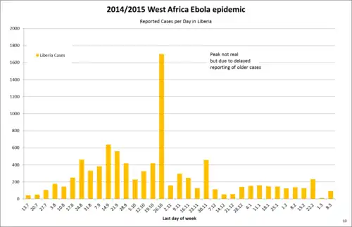 A continuación se muestra con barras amarillas los casos reportados a final de semana. La fecha de cada barra se indica aquí como día.mes en cifras. El mensaje en inglés resalta el hecho de que, según la OMS, el descenso en las cifras de Liberia probablemente sea irreal y refleje un probable deterioro en la capacidad de los cooperantes para registrar datos epidemiológicos precisos.[cita requerida]