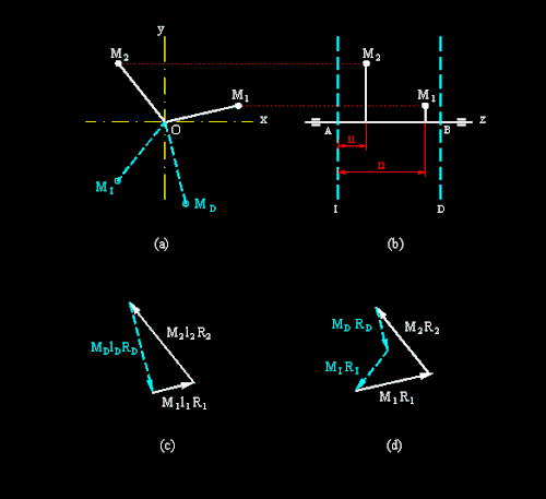 1.- Hacer sumatorio de momentos (ecuación 2) de las fuerzas centrífugas respecto al punto A o al punto B (puntos de intersección de los planos de equilibrado con el eje) para evitar que aparezcan las fuerzas en el cojinete A y en el cojinete B respectivamente. En este caso está hecho respecto al punto A.