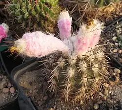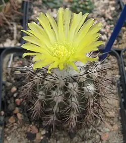 Posee un único tallo, globoso, de 15 cm de altura y 7 cm de diámetro, deprimido en el ápice. Tiene de 14 a 18 costillas, sobresalen 5 mm, con aréolas muy juntas, finamente recubierta de un fieltro gris blanquecino, en las primeras fases. Espinas radiales, de 20 a 30, delgadas, punzantes, de 5 a 8 mm de largo, negras, luego se vuelven grisáceas, con 4 espinas centrales en forma de cruz, gruesas y de 1 a 1,5 cm de largo. La parte apical del tallo tiene un fieltro gris plateado, en cuyo centro aparecen las flores, de 2 cm de diámetro, amarillo oro a verdoso muy claro. Frutos alargados en la madurez, inmaduros son globulares, rojos, y un perianto que desecado persiste en la extremidad junto a algunas sedas.
