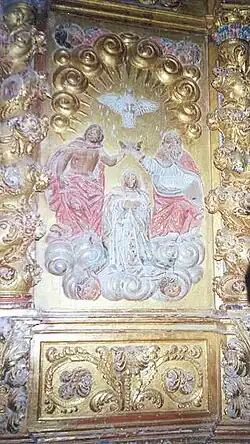 En su ábside, que cuenta con un ventanal aspillerado y un vano absidal de la iglesia superior pero que está cegado, se encuentra el retablo barroco que tiene representado seis escenas; la coronación de La Virgen por las tres Personas de la Trinidad, la Resurrección de Cristo, El Nacimiento de Cristo, la Adoración de los Reyes Magos, la Asunción de María al Cielo y la Anunciación.[4]