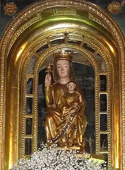 La escultura es de madera tallada policromada y dorada con pan de oro, datada entre los siglos XIV y XV, tiene una medida de 60 centímetros de altura y se encuentra en posición sedente sobre un trono sin respaldo ni brazos, portando corona sobre la cabeza y con el Niño Jesús sentado sobre la rodilla izquierda, éste tiene su brazo derecho levantado en actitud de bendecir y el izquierdo reposa en la rodilla con un libro en la mano. La Virgen sostiene una flor en la mano derecha mientras que su mano izquierda se apoya suavemente sobre el hombro de su hijo. Las vestiduras son de túnica para el Niño y túnica con velo y manto para la madre. Ambas imágenes miran de frente y muestran una faz sonriente.[5]