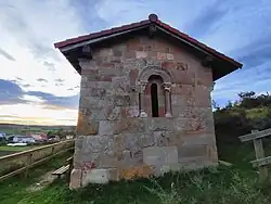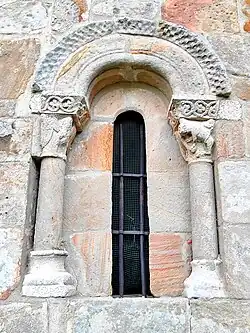 Con una cubierta de bóveda de cañón, presenta una cabecera recta en el que se abre un vano abocinado. Dicho vano en su exterior está formado por un arco de medio punto moldurado y presenta motivos decorativos típicos de la época como es el ajedrezado jaqués. La ventana flanqueada por dos columnas presenta capiteles en los que se representan dos leones y un águila.[2]