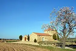 «Los muros son de mampostería ordinaria, con sillares en las esquinas. La entrada posee arco de medio punto basado en dovelas de piedra caliza, situada en la fachada meridional, ligeramente descentrada hacia los pies. [...], la construcción posee varias aberturas en el muro: tres cuadrangulares en la fachada meridional de la nave, bajo el alero y otra vertical, a modo de arpillera, en el centro del muro del cuerpo de cabecera. Por encima del cabio superior de esta abertura hay dos piezas de piedra longitudinales, con una tercera cuadrangular en el centro, que luce una cruz trinitaria labrada (circular)».[1]Veguillas de la Sierra, Teruel, Alfredo Sánchez Garzón