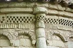El ábside está construido en piedra de sillar bien trabajada. Es un raro ejemplo de construcción lombarda por estas tierras en que no se da otro caso igual. Presenta unos arquillos ciegos lombardos labrados de 3 en 3 y separados por columnas que no son monolíticas y que sustituyen a las tradicionales lesenas y un friso en esquinillas típicamente lombardo. Esta ornamentación se une al ajedrezado jaqués.