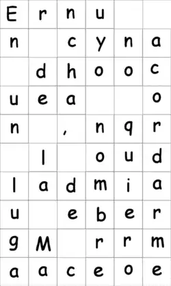 El texto cifrado es el resultado de tomar linealmente, sin saltos, la misma tabla pero ahora recorriéndola en columnas. El mensaje cifrado queda así: «Ernu n cyna dhoocuea on ,nqr l oudladmiau ebergM rrmaaceoe».