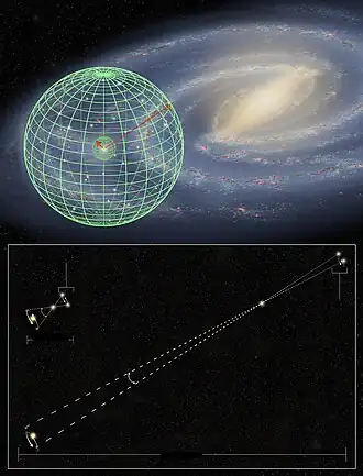 Para medir la distancia a las estrellas cercanas se usa el paralaje astronómico. El paralaje es el cambio en la posición aparente de una estrella en el cielo debido al movimiento de la Tierra en su órbita alrededor del Sol. Las estrellas más lejanas parecen fijas mientras que las cercanas se mueven en una elipse más o menos excéntrica dependiendo del ángulo relativo de la estrella con respecto a la eclíptica. La distancia obtenida con este método viene dada en función del ángulo medido y de la distancia de la Tierra al Sol (Unidad astronómica), así que su precisión depende directamente de la precisión de las dos medidas anteriores. El satélite Hipparcos midió sistemáticamente entre 1989 y 1993 el paralaje de 2,5 millones de estrellas, medidas con las que se pudieron estimar muchas de sus distancias.