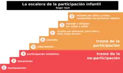 - Peldaño 8. Iniciado por niñas y niños, con decisiones compartidas con las y los adultos. Las niñas y niños inician un proyecto propio, dirigen y gestionan, pero continúan en colaboración con personas adultas, no la rechazan. En este peldaño se puede hablar del nivel más auténtico de participación infantil, conocido como participación protagónica.[5][6][7]