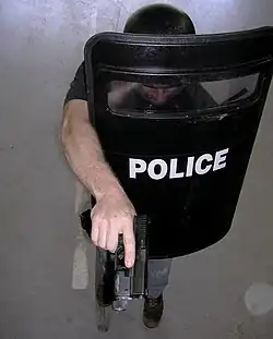 Los escudos tácticos a menudo tienen un puerto de disparo para que el oficial que sostiene el escudo pueda disparar un arma mientras está protegido por el escudo, y a menudo tienen un puerto de visualización de vidrio a prueba de balas. Por lo general, los emplean policías especializados, como equipos SWAT en escenarios de entrada y asedio de alto riesgo, como rescate de rehenes y allanamiento de recintos de pandillas, así como en operaciones antiterroristas.