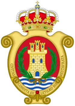 Escudo ovalado, en campo de gules, un castillo de oro con su puerta y ventanas aclaradas de azur, almenado, mazonado de sable y donjonado de tres torres, siendo la del centro más alta que las otras dos. A la diestra del mismo una rama de olivo, y una rama de palma a la siniestra. En punta tres ondas de azur. Contorno apergaminado con la inscripción latina «Civitas Condita Ex Lethaeo Bis Restavrata». Al timbre corona real cerrada.BOJA Año XXXVII Número 6.[2]