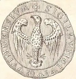 En 1327 apareció el primer sello en el que se mostraban el águila y el escudo de la cruz. Esta composición continuó figurando en el sello durante todo el siglo XIV. En 1395 se fijaron los esmaltes (colores) del campo del escudo (de gules) y de la cruz (de plata). Se introdujeron algunas variantes de poca importancia, relacionadas con el diseño, por lo que se mantuvo el esquema adoptado en 1327.