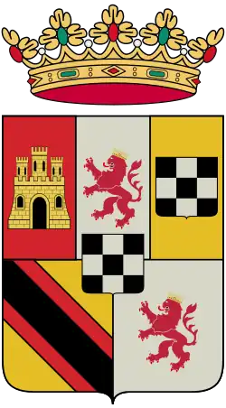 - I: Terciado en palo: 1.º de gules, un castillo de oro, almenado, esclarecido y mazonado de sable, 2.º de plata, un león rampante de gules, coronado de oro, armado y lampasado de lo mismo y 3.º de oro, escudete hispano-francés, jaquelado de nueve piezas de plata y sable, en tres órdenes.