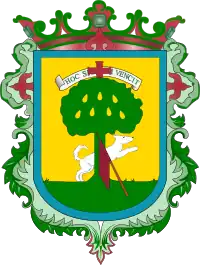 Presentaba la forma del escudo español semicircular o de medio punto, y está ceñido por una bordura azul. Contiene, en campaña de sinople (verde) y campo de oro, un árbol fustado también de sinople y frutado con siete chirimoyas o zapotes de oro; a su tronco reclinada un asta de lanza con bandera de gules y detrás, un perro en salto contornado de plata; en lugar de honor una cruz sencilla de gules, acompañada de una divisa semicircular de plata con el mote de sinople: HOC SIGNUM VINCIT (Este Signo Vence).Su timbre es una corona ducal de sinople con fondo de gules y tres esmeraldas naturales. Asimismo grandes hojas de acanto de sinople, discurren verticalmente desde el timbre por ambos flancos curvándose hacia el centro rematando en forma lancetada.