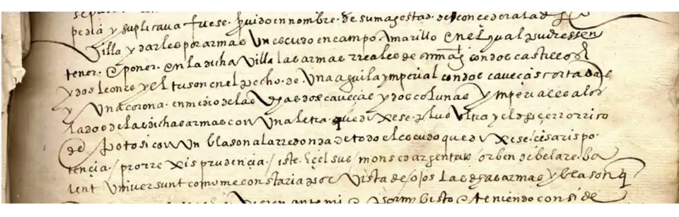 Don Francisco de Toledo, Mayordomo de S.M., su visorrey, gobernador y Capitán General en estos reinos y provincias del Pirú y Tierra Firme, Presidente de la Audiencia real que reside en la ciudad de los Reyes, & Por cuanto estando en la dicha Villa imperial de Potosí, en prosecución de la visita general que por mi persona hago en estos reinos, por parte de la dicha villa que fue fecha Relación: que ya me era notorio el bien universal que se habia seguido y seguía de haberse poblado la dicha Villa y asiento della, para la labor y beneficio de las minas de aquel cerro rico y el mucho acrescentamiento que tenia la hacienda real de su magestad, en los quintos y derechos reales que allí se le tuviese el autoridad y noblecimiento que se le debía y para que siempre se pudiese conservar con él, como los vecinos y moradores della lo pretendían, me pedía y suplicaba fuese servido, en nombre de su majestad, de conceder a la dicha Villa y darle por armas un escudo en campo amarillo en el cual pudiessen tener y poner en la dicha Villa las armas reales de su magestad, con dos castillos y dos Leones, y el toisón en el pecho de UN ÁGUILA IMPERIAL CON DOS CABEZAS CORTADAS y una corona en medio de las dichas dos cabezas, y dos columnas imperiales a los lados de las dichas armas con una letra que dixiese PLUS ULTRA y el dicho cerro rico de Potosí con un blasón a la redonda de todo el escudo que dixese = CESARIS POTENTIA = PRO REXIS PRUDENTIA = ISTE EXCELSUS MONS ER ARGENTEUS = ORBEM DEBELARE VALENT UNIVE[R]SISUNT = como constaría por vista de ojos las dichas armas y blasón que en un escudo dellas se vieren ante mi, e por mi visto, e teniendo consideración a lo que dicho es y al noblecimiento de la dicha Villa y a que por las causas susodichas es justo que su majestad en todo lo que oviere lugar le haga merced. En su real nombre y en virtud de sus poderes y comisiones y de su persona real, para su noblecimiento y autoridad, puedan tener y poner las dichas armas y blason que de susodicho y referido en el dicho escudo con el dicho campo amarillo y ponerlas en los lugares públicos e iglesias que la dicha Villa hiziere, en las puertas principales dellas y de la dicha Villa y en las demás partes donde se pudieren y devieren poner para el ornato y noblecimiento della; y abrir un sello de las dichas armas con el dicho blason con el cual puedan sellar y sellen los despacho que se obraren a su magestad y a sus vissoreyes y gobernadores y otras qualesquier que el dicho cavildo despachare, en que convenga ponerse el dicho sello por su autoridad y secreto siendo necesario doy a la dicha Villa poder y comisión en forma cual para el caso se requiere y mando que en ella no se pueda poner ni ponga impedimento alguno sopena de dos mil pesos de oro para la cámara de su magestad. Yo en su real nombre le otorgo si por bien Fecha en la ciudad de Arequipa a dos días del mes de agosto de mil e quinientos y setenta y cinco años = Va entre renglones, no, y testado e DON FRANCISCO DE TOLEDO. Por mandato de su Excelencia Alvaro Ruiz de Navamuel.[4]