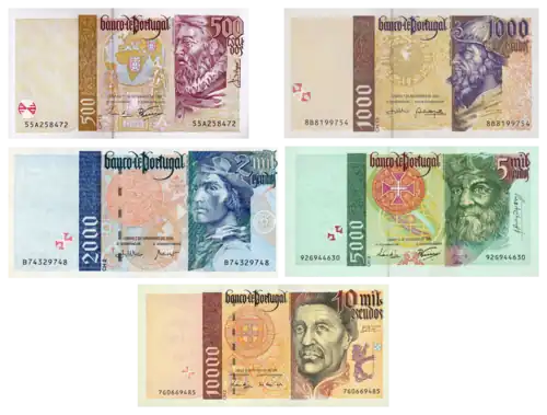 La última serie de billetes portugueses fue emitida entre 1995 y 1997, y permaneció en vigencia hasta la entrada del euro. Los cinco billetes estaban dedicados a importantes navegantes de la época de los descubrimientos portugueses. Los billetes en circulación eran los de las denominaciones que a continuación se detallan: