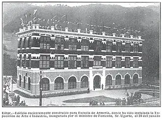 El ayuntamiento de Éibar encargó el proyecto de construcción del edificio que albergaría la escuela al arquitecto Augusto Aguirre. Las obras comenzaron en 6 de enero de 1913, se trataba de un edificio de tres plantas de base rectangular abierto a un cuidado jardín, en la planta baja se encontraba el taller de maquinaria, el almacén, la biblioteca, el museo, el gabinete de física y la dirección, en la primera planta estaban las aulas y la sala de ajuste con 75 puestos de trabajo. En la última planta estaban dos aula de matemáticas y una de dibujo.