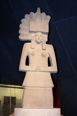 La escultura representa a Tlazoltéotl, (en náhuatl "Devoradora de la Mugre") diosa mexica de la tierra, el sexo, la lujuria y el nacimiento en la cultura azteca. Era la diosa que eliminaba del mundo el pecado y la diosa más relacionada con la sexualidad y las fases de la Luna. La fertilidad era un tema recurrente en el arte huasteca precolombino, representada por figuras de piedra de diosas femeninas, ancianos y falos. Las primeras comparten siempre ciertas características: rigidez, manos unidas sobre el estómago, pechos desnudos y suelen vestir una falda larga y un gran tocado. Este tocado habitualmente se compone de una sección rectangular bajo otra cónica, delante de una cimera en abanico, como en este caso. Los aztecas conquistaron la zona del Golfo de México a mediados del siglo XV, bajo el reinado de Moctezuma Ilhuicamina (1440 a 1469) que consagró una ampliación del Templo Mayor de Tenochtitlán con una ceremonia en la que se sacrificaron gran número de prisioneros huastecas a Xipe Totec, dios de la fertilidad.