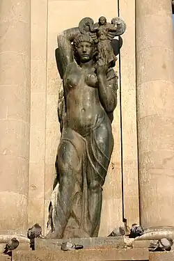 | El Espíritu popular | Jaume Otero | Bronce | 2,15 x 1 x 0,40 | Ubicada en el mismo pilar que la anterior, representa una mujer con el brazo derecho alzado sosteniendo una corona de laurel, mientras que con la mano izquierda se aguanta la túnica en la cintura. Aunque por el título parece tratarse de una alegoría, la iconografía es confusa. La estilización de la figura y una cierta artificiosidad confieren a esta obra un aire cercano al art déco. En su base se representa el escudo de Barcelona. Fundición: Gabriel Bechini (Barcelona).[35] | |