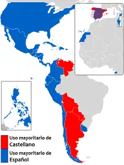 El español o castellano es el idioma oficial de iure o de facto, en estas jurisdicciones en América: Argentina,[2] Bolivia,[3] Chile,[2] Colombia,[4] Costa Rica,[5] Cuba,[6] Ecuador,[7] El Salvador,[8] Guatemala,[9] Honduras,[10] México,[11] Nicaragua,[12] Panamá,[13] Paraguay,[14] Perú,[15] República Dominicana,[16] Uruguay,[2] Venezuela[17] y Puerto Rico.[18] Todos estos territorios conforman la región denominada Hispanoamérica. Existen también grandes comunidades hispanohablantes autóctonas o inmigrantes en países americanos donde el español no es idioma oficial, como en Estados Unidos, donde es el segundo idioma más hablado; Belice, Canadá, Trinidad y Tobago y Brasil, al igual que en otros territorios como en las Islas Malvinas.