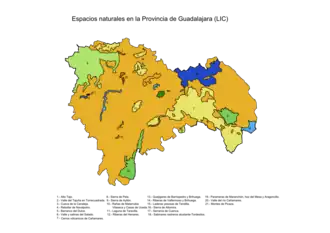 Los Lugares de Importancia Comunitaria (LIC),[10] de la provincia de Guadalajara, son todos aquellos ecosistemas protegidos con objeto de contribuir a garantizar la biodiversidad mediante la conservación de los hábitats naturales y de la fauna y flora silvestres en el territorio consideradas prioritarias por la directiva 92/43/CEE de los Estados miembros de la Unión Europea. Estos lugares, seleccionados por los diferentes países en función de un estudio científico, pasarán a formar parte de las Zonas de Especial Conservación, que se integrarán en la Red Natura 2000 europea.