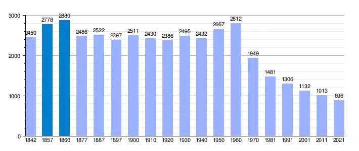 | Gráfica de evolución demográfica de Esparragosa de Lares[4] entre 1842 y 2021 |