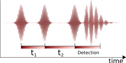 La espectroscopía infrarroja bidimensional no lineal[35][36] es la versión infrarroja de la espectroscopía de correlación. La espectroscopía infrarroja bidimensional no lineal es una técnica que se ha hecho disponible con el desarrollo de pulsos láser infrarrojos de femtosegundos. En este experimento, primero se aplica un conjunto de pulsos de bomba a la muestra. A esto le sigue un tiempo de espera durante el cual se permite que el sistema se relaje. El tiempo de espera típico es de cero a varios picosegundos, y la duración se puede controlar con una resolución de decenas de femtosegundos. Luego se aplica un pulso de sonda, lo que resulta en la emisión de una señal de la muestra. El espectro infrarrojo bidimensional no lineal es una gráfica de correlación bidimensional de la frecuencia ω1 que fue excitada por los pulsos iniciales de la bomba y la frecuencia ω3 excitada por el pulso de la sonda después del tiempo de espera. Esto permite observar el acoplamiento entre diferentes modos vibracionales; debido a su resolución de tiempo extremadamente fina, se puede usar para monitorear la dinámica molecular en una escala de tiempo de picosegundos. Todavía es una técnica en gran parte inexplorada y se está volviendo cada vez más popular para la investigación fundamental.