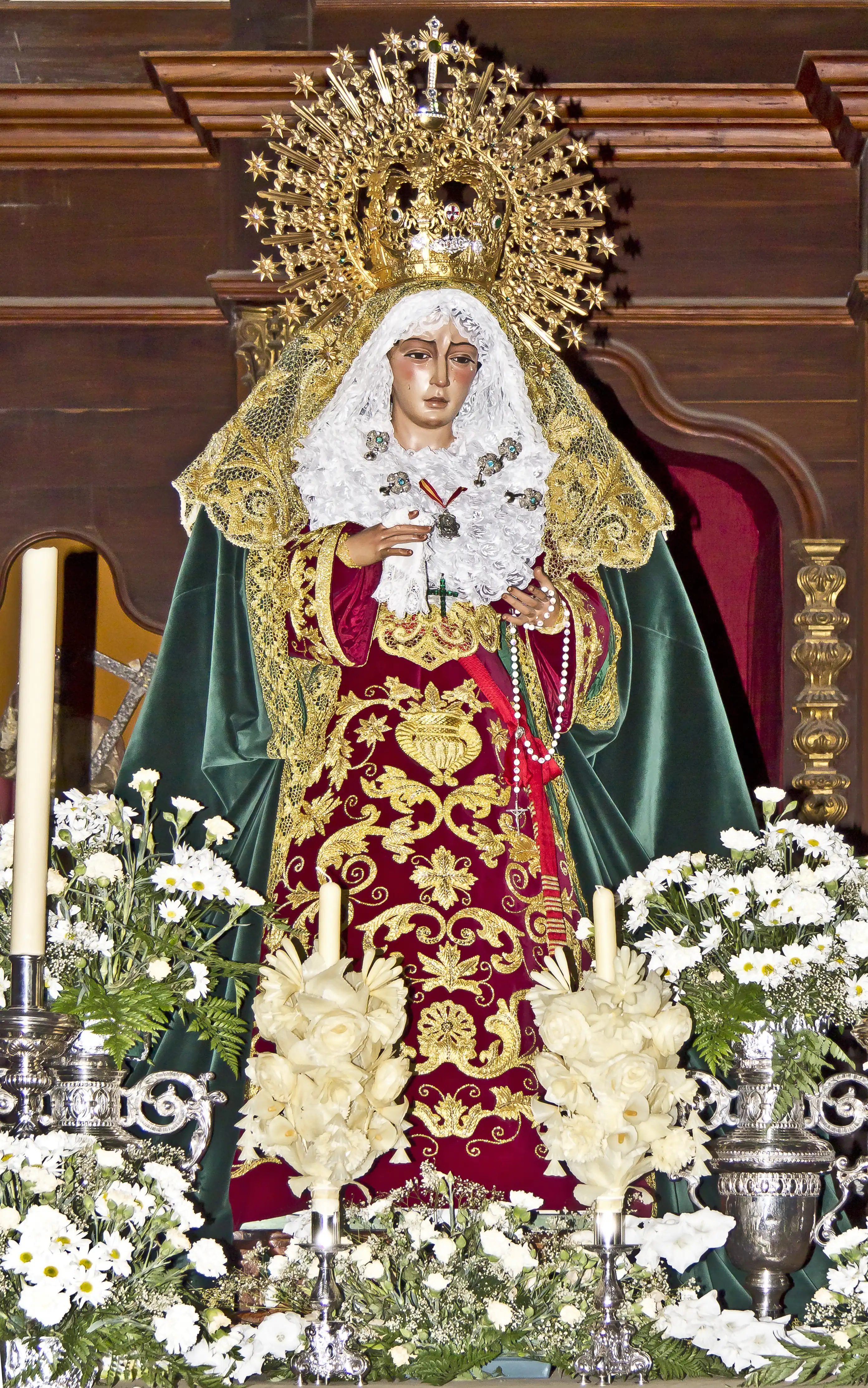 Es una talla de candelero realizada en el siglo XVII por un autor anónimo, aunque ha sido atribuida a diversos escultores relacionados con el taller de Pedro Roldán, entre los que destaca su hija La Roldana. En 1925 protagonizó el primer besamanos público a una dolorosa.[2] Fue coronada canónicamente en 1964, convirtiéndose en la segunda imagen dolorosa de Sevilla en obtener esta dignidad, precedida de la Virgen de la Amargura. En 1971 el alcalde de la ciudad, Juan Fernández Rodríguez le impuso la Medalla de Oro de Sevilla, y en 2024 el papa Francisco le concedió la Rosa de oro.[3][4]
