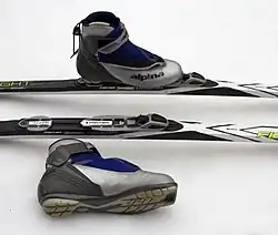 Las botas de esquí se sujetan al esquí solo en la punta, por lo que dejan el talón libre. Dependiendo de la aplicación, las botas pueden ser ligeras (esquí de rendimiento) o más pesadas y de mayor soporte (esquí de montaña).[63]