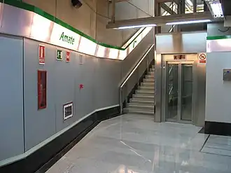 La estación de Amate, al igual que todas las construidas durante esa época, cuenta con andenes laterales, ascensor para personas con movilidad reducida, escaleras mecánicas, venta de billetes automática y sistema de evacuación de emergencia.