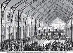 La estación comenzó a construirse en 1879, siguiendo el proyecto del ingeniero francés Émile Cachelièvre,[13]quien perteneció a la escuela de Gustave Eiffel. Durante años se relacionó la obra con el propio Eiffel, erróneamente.[14][15] En el proyecto también participaron los arquitectos españoles Calleja, Espinal y Uliarte.[16] Cachelièvre aplicó un nuevo sistema, consistente en una serie de cuchillos armados unidos a los pilares y hundidos en los cimientos, presentado por Henri de Dion en la Exposición Universal de París de 1878. La construcción original de Dion se perdió, por lo que la estación tiene el valor añadido de ser la más antigua conservada que utiliza el sistema de Dion. La estructura metálica de la nave central fue construida en Bélgica por la firma Fives-Lille, como la estación de Orsay de París, y posteriormente transportada a Madrid para el montaje final. La obra fue inaugurada a las cuatro y media de la tarde del 30 de marzo de 1880, solo once meses después del comienzo de las obras, por el rey Alfonso XII acompañado del Gobierno de Cánovas del Castillo.